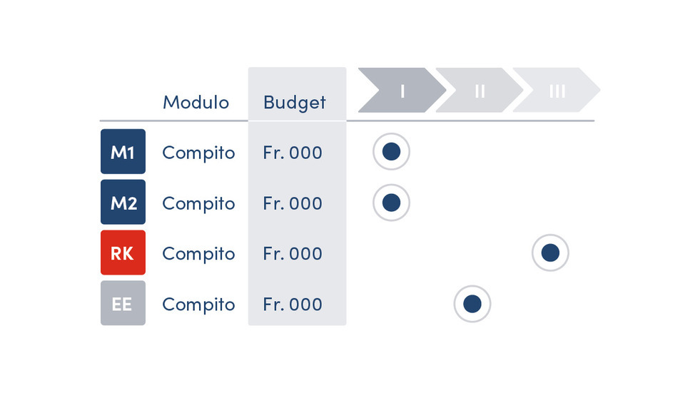 - Misure: Dopo aver prescelto una o due strategie opzionali, saranno sviluppati i piani d’azione. In primo luogo, vengono configurate misure adatte per avviare la realizzazione. In seguito saranno quantificati i tempi e le risorse necessari. Come risultato, i responsabili avranno a loro disposizione una tabella di marcia tanto fondata quanto praticabile.